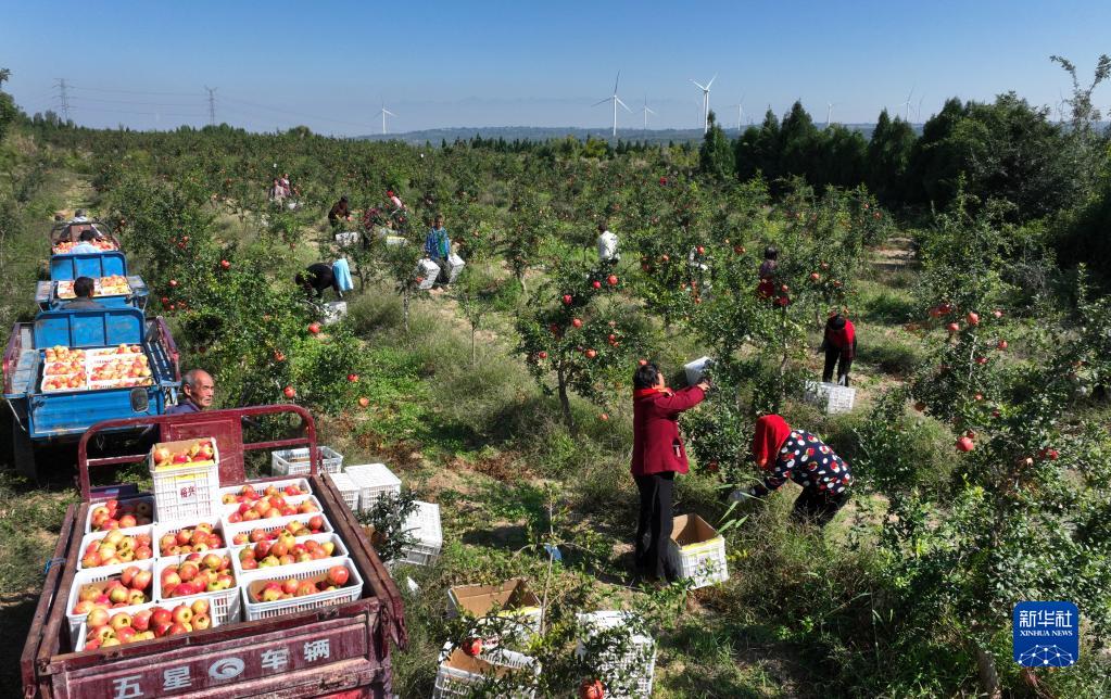 9月26日,在陕西省潼关县港口社区东台塬,裕兴农业开发有限公司的员工在采摘软籽石榴(无人机照片)。