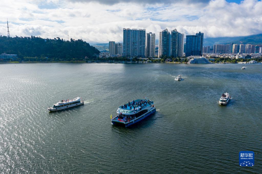9月26日,新能源游船“风花雪月号”在洱海行驶(无人机照片)。