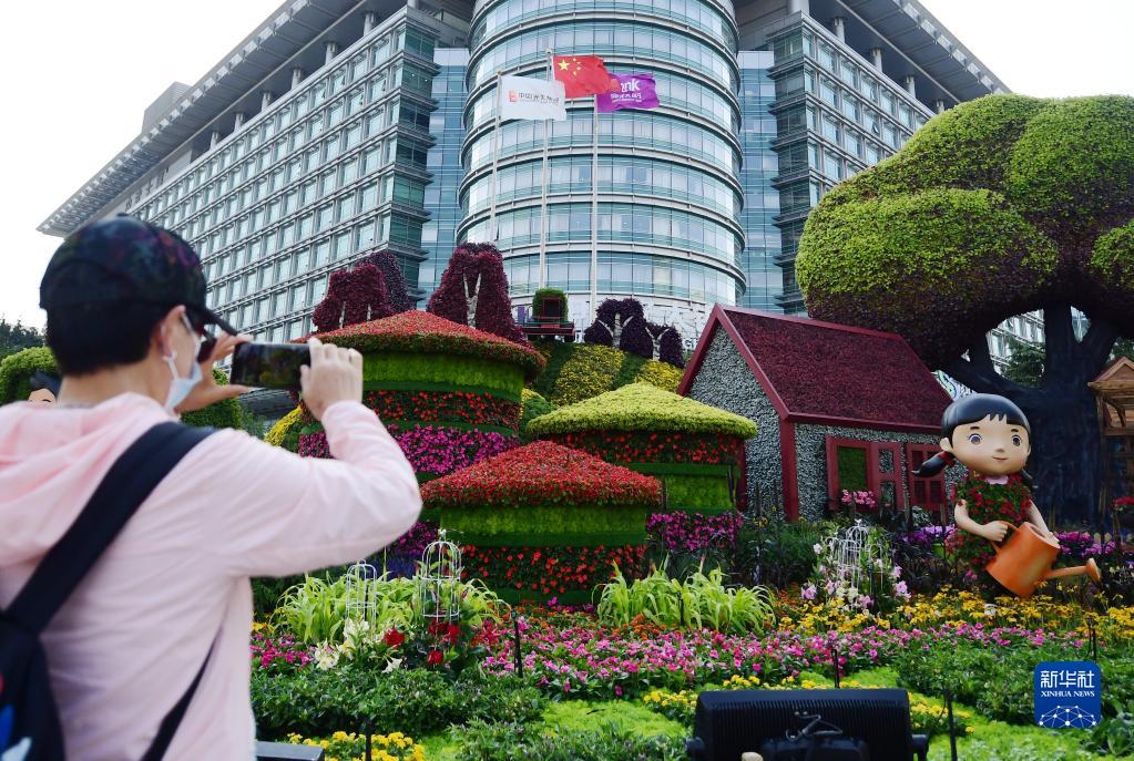 9月27日,市民在西单路口的“富裕生活”花坛前拍照。