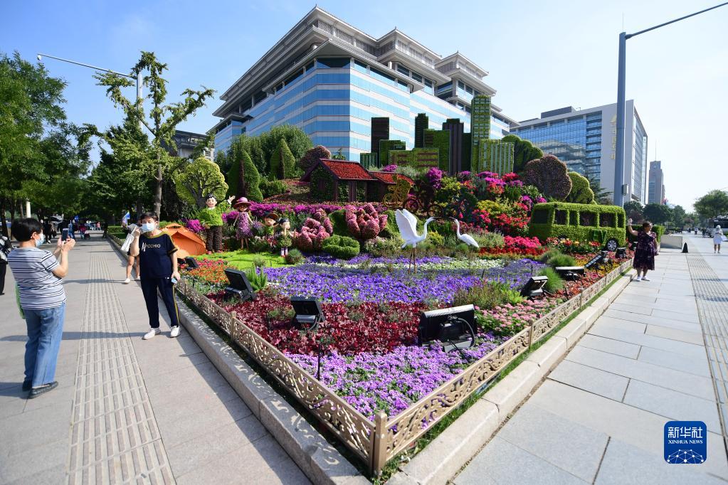 国庆节假期日益临近,北京天安门广场的“祝福祖国”巨型花果篮及长安街沿线14组立体花坛精彩亮相,吸引游人及市民观赏留念。