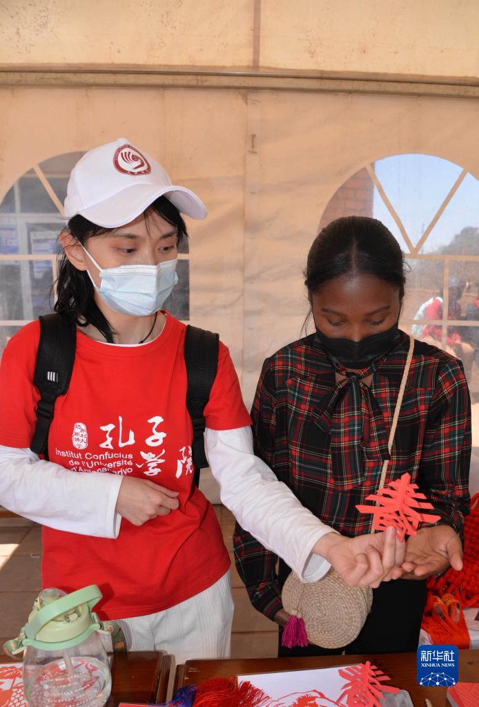 9月27日,塔那那利佛大学孔子学院的师生们一起表演剪纸。