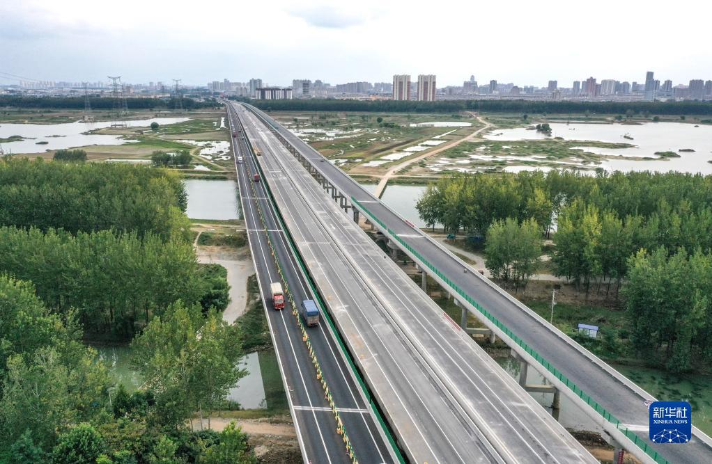 扩建中的新沂河特大桥正在施工中(9月27日摄