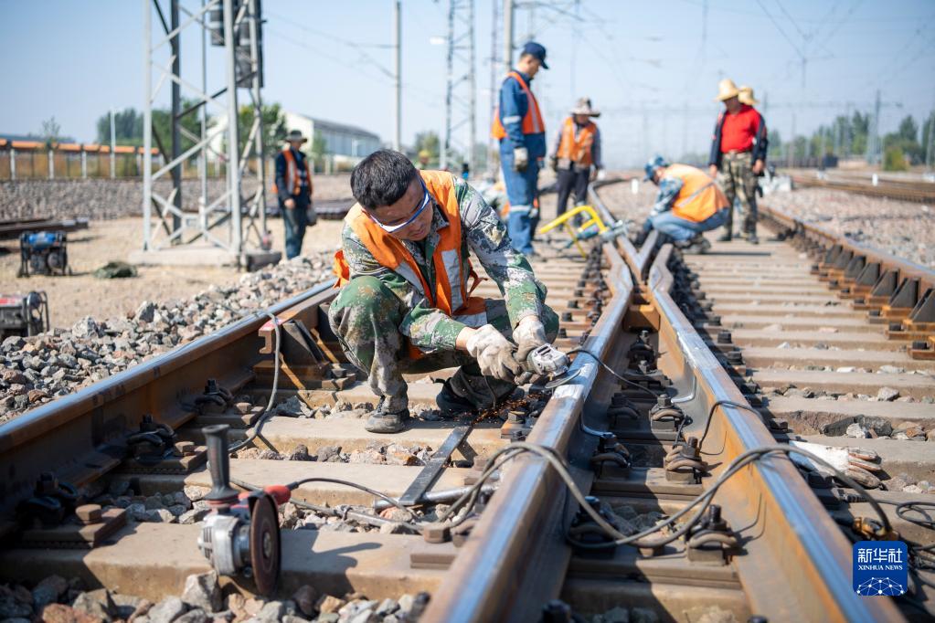 9月28日,中国铁路太原局集团有限公司大同工务段工人在大秦线湖东站进行施工作业。