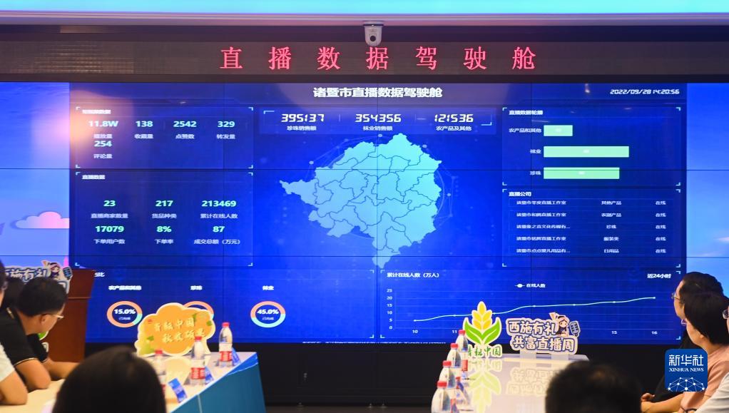 9月28日,诸暨市共富直播周启动仪式现场的大屏幕上显示共富直播周的观看人数、销售额、销售种类等实时数据。