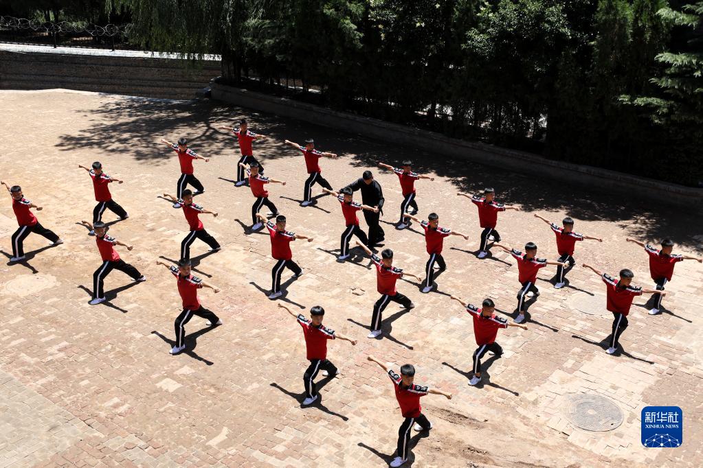 这是河南嵩山少林塔沟武校的学生在李迎港的指导下上课(2022年7月7日摄)。