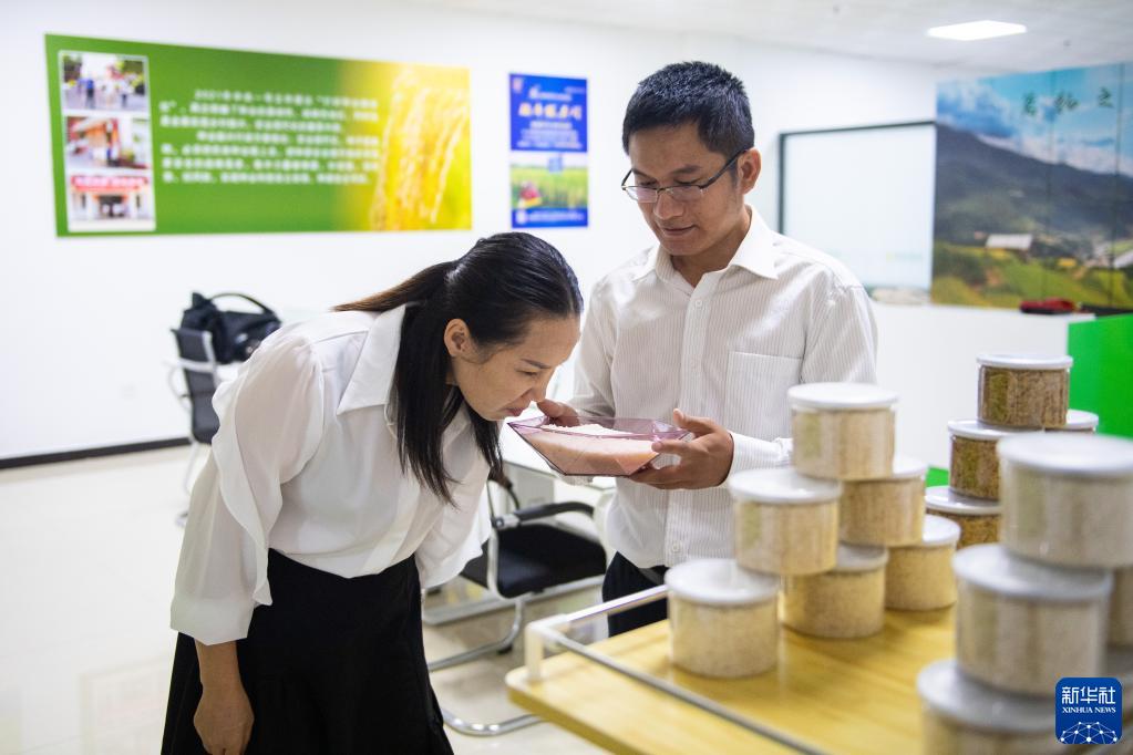 9月29日,在位于常德科技创新创业孵化产业园的常德粮丰农业科技有限公司,工作人员(右)向来访者介绍公司培育的水稻品种。