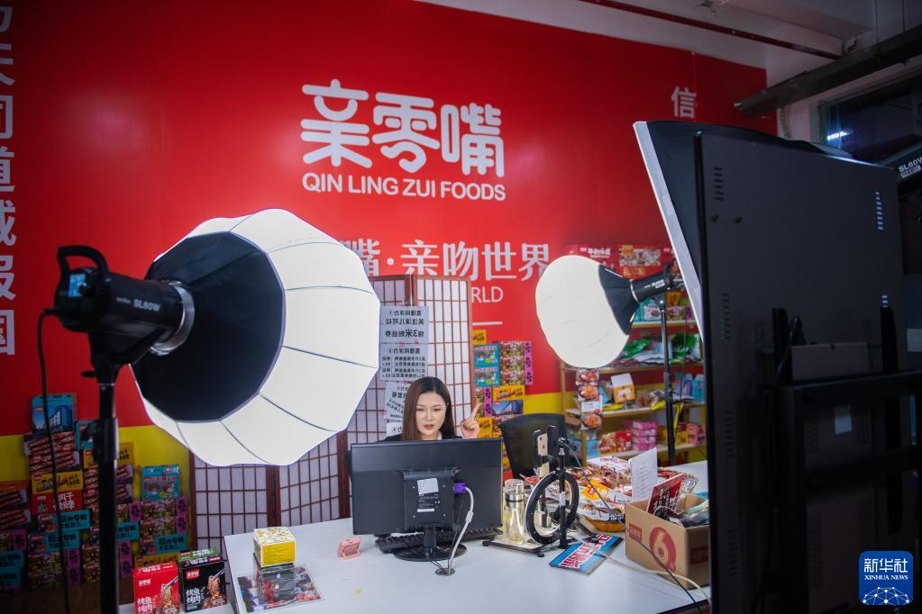 9月29日,在位于常德科技创新创业孵化产业园的湖南亲零嘴食品有限公司,工作人员直播推销零食。