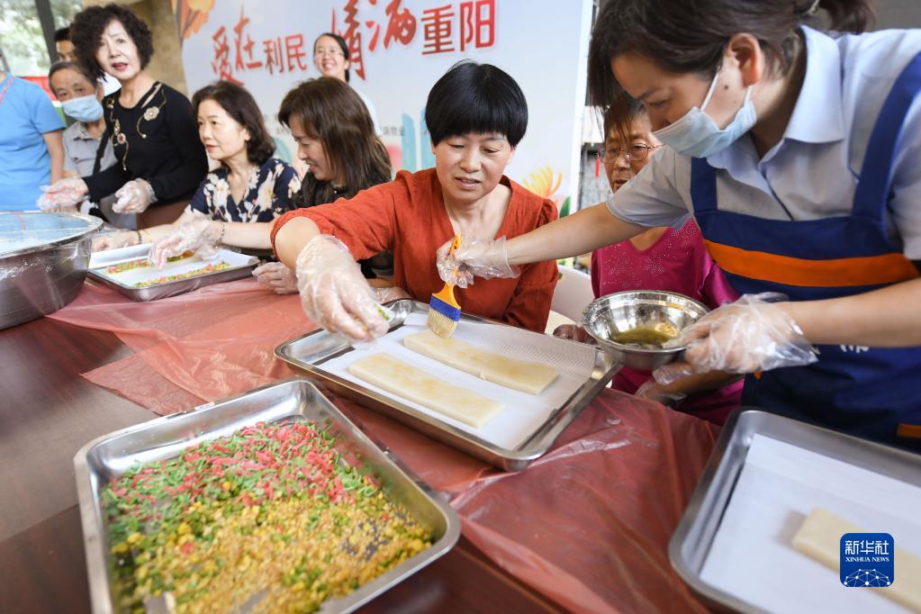 9月29日,在爱山街道利民社区,一家老字号企业的工作人员指导老年居民制作“重阳糕”。