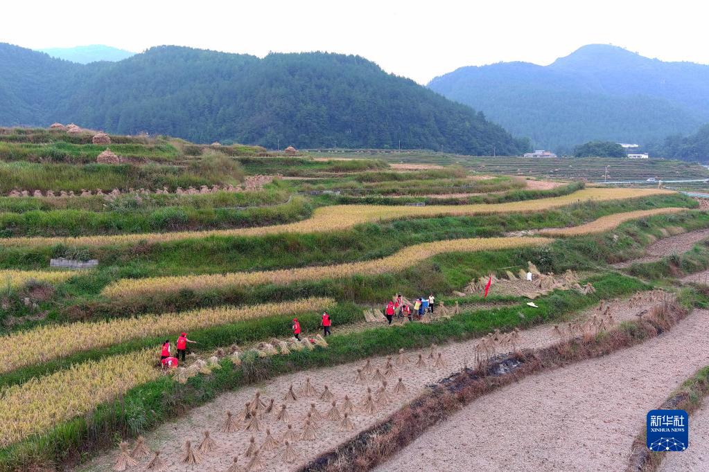 9月29日,贵州省龙里县湾滩河镇党员志愿者在稻田里帮助农户收割水稻(无人机照片)。