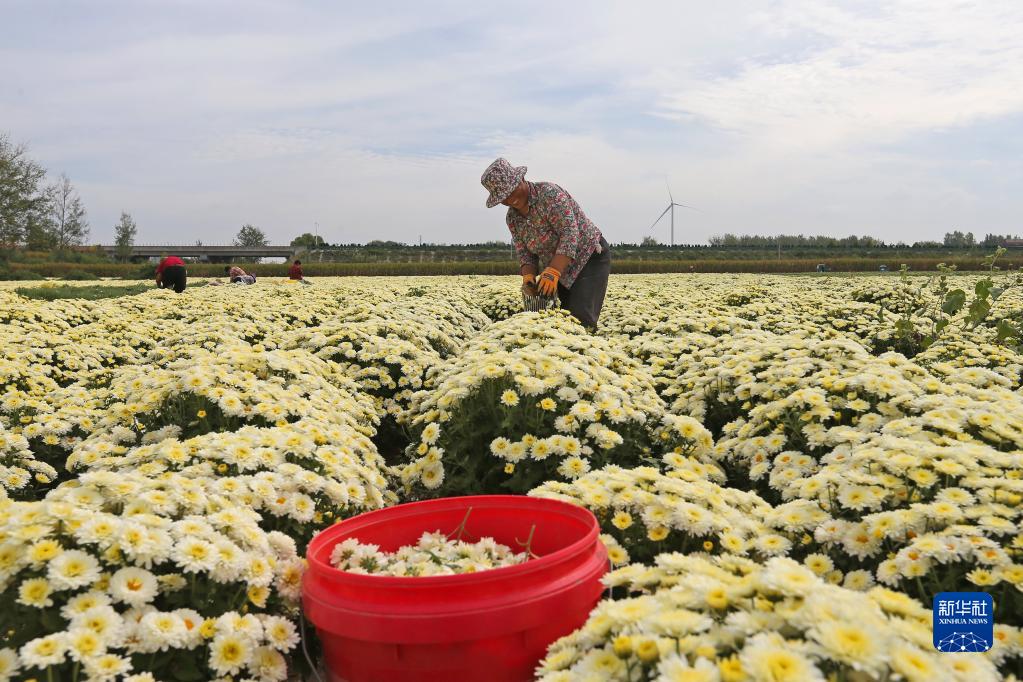9月29日,在安徽省濉溪县四铺镇菊花种植基地,村民在采收药用菊花。