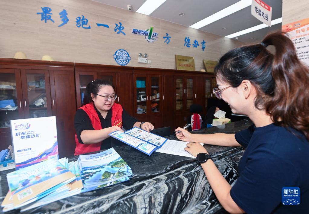 9月30日,在杭州市临安区锦南街道便民服务中心,工作人员(左)给企业员工解释最新的人才政策并让她填写相关表格。