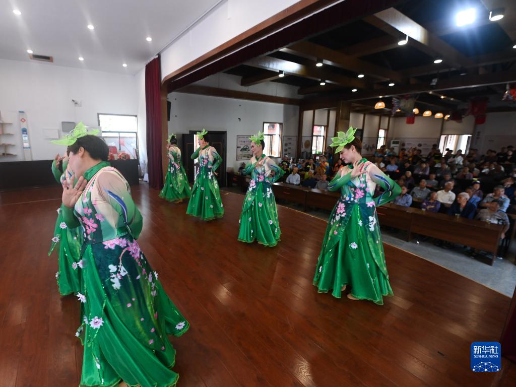 9月30日,老人们在杭州市临安区河桥镇河桥村文化礼堂观看“柳溪暖阳”党员助老志愿服务队编排的节目。