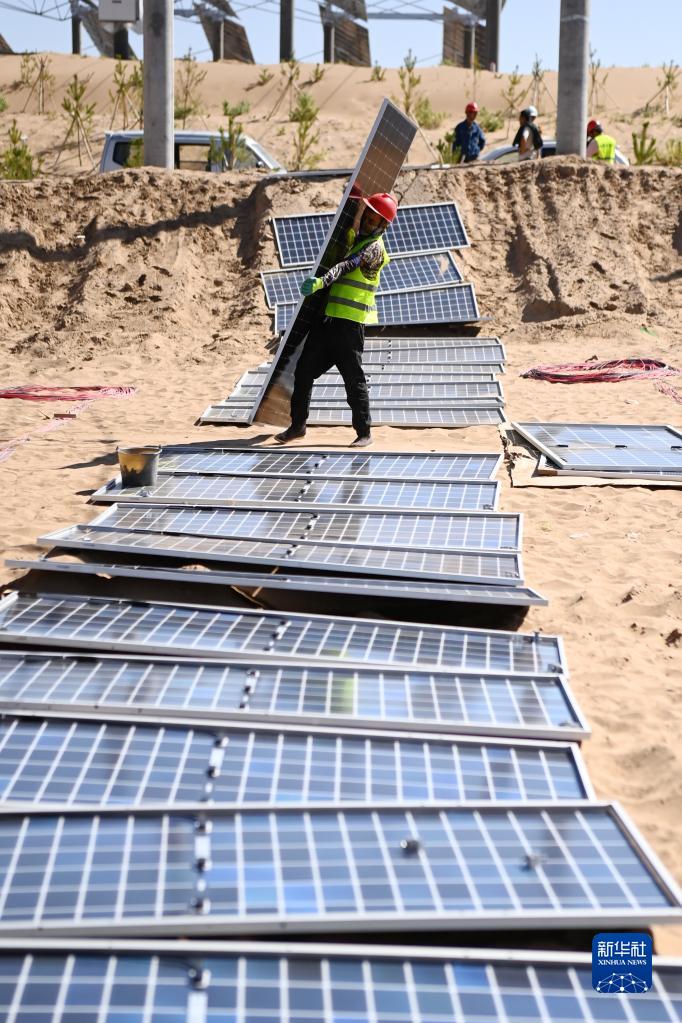 9月29日,在位于甘肃省武威市凉州区的甘肃武威50万千瓦立体光伏治沙产业化示范项目建设现场,施工人员在搬运光伏板。