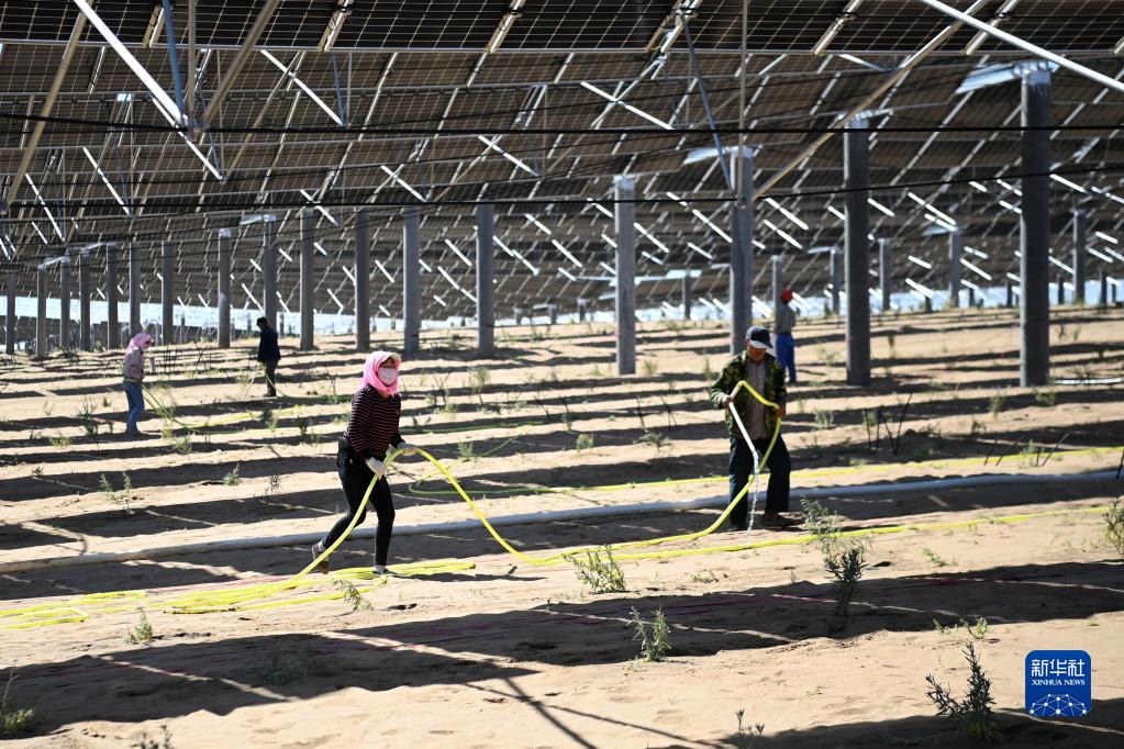9月29日,在位于甘肃省武威市凉州区的甘肃武威50万千瓦立体光伏治沙产业化示范项目建设现场,工人给光伏板下的沙生植物浇水。