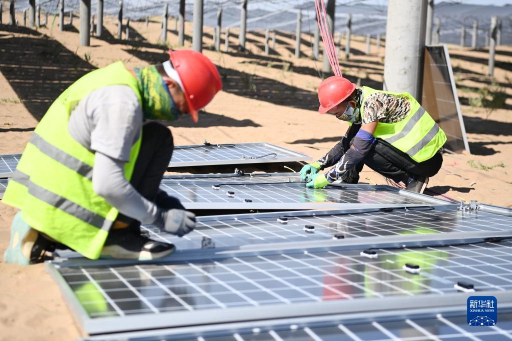 9月29日,在位于甘肃省武威市凉州区的甘肃武威50万千瓦立体光伏治沙产业化示范项目建设现场,施工人员在安装光伏板挂件。