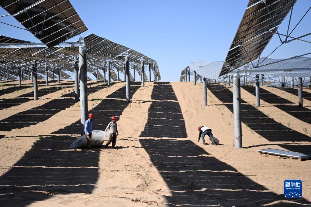 作为我国以沙漠、戈壁、荒漠地区为重点的大型风电光伏基地项目,甘肃武威50万千瓦立体光伏治沙产业化示范项目自启动建设以来,将太阳能开发与腾格里沙漠治理有机结合,在建设光伏电站的同时,在光伏板下栽植沙生植物,既能起到防风固沙的作用,也为下一步发展板下农牧业奠定基础。目前,该项目建设已接近尾声,预计今年年底建成并网发电。