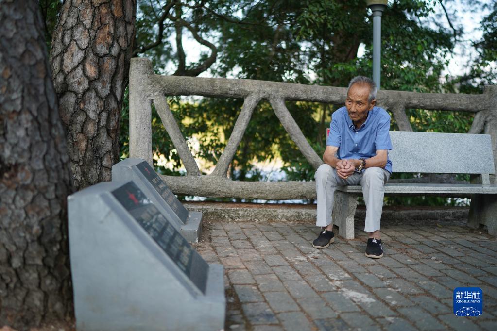 9月16日,红军烈士华钦材的后代华从祁坐在松树下与松树“说话”。
