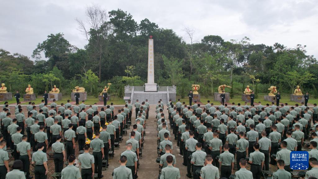9月30日,南部战区陆军第74集团军某旅组织官兵在旅革命烈士纪念碑前举行“缅怀革命先烈 弘扬英雄精神”主题教育活动(无人机照片)。