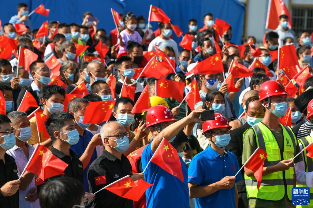 10月1日,在四川省甘孜州泸定县得妥镇天池山村繁荣集中过渡安置点,人们在升国旗仪式后挥舞国旗。