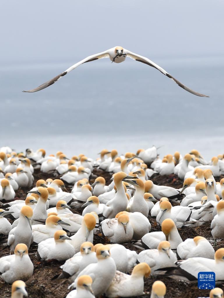 这是9月25日在新西兰北岛东海岸拐子角塘鹅保护区拍摄的塘鹅。