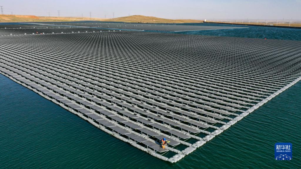 这是位于宁夏灵武市的国家能源集团宁夏电力公司宁东电厂3×5.98兆瓦漂浮分布式光伏发电项目(6月17日摄,无人机照片)。