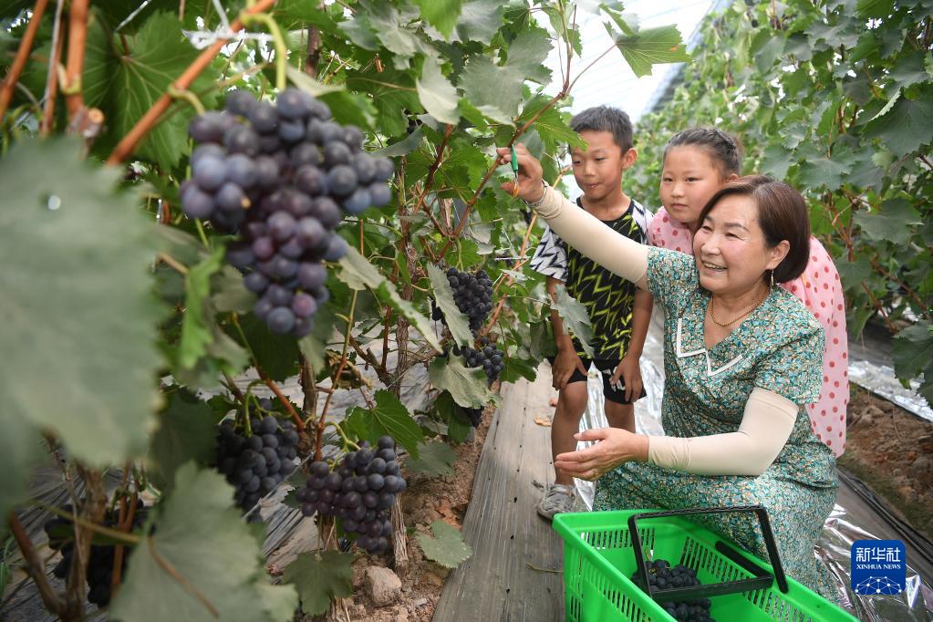 7月5日,在位于黄河岸边的宁夏青铜峡市大坝镇韦桥村,游客观光采摘大棚内采摘葡萄。
