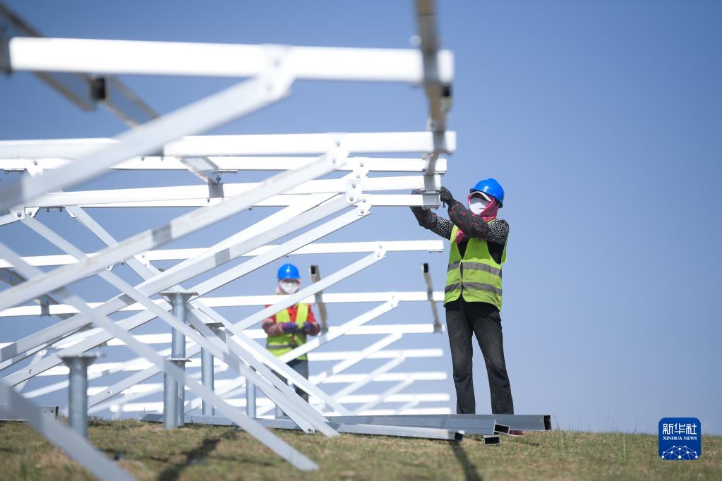 6月8日,在青海省海南藏族自治州共和县,工人在黄河上游水电开发有限责任公司海南基地共和县100万千瓦光伏项目施工。