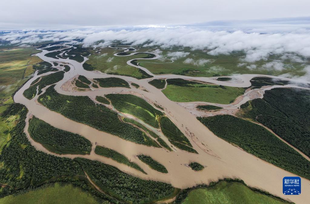 俯瞰位于四川省若尔盖县唐克镇的白河牧场的黄河出川口(2022年8月16日摄,无人机照片)。