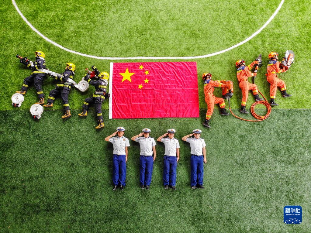 10月1日,贵州省遵义市的消防队员在“我和国旗合个影”主题活动中拍照。