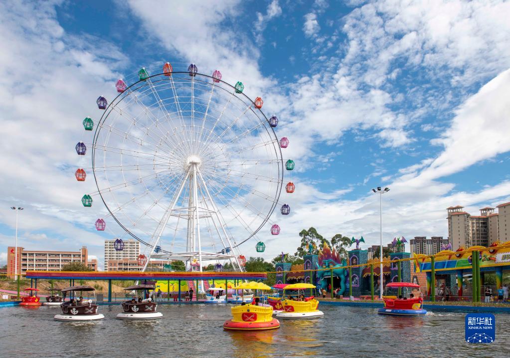 10月1日,市民在湖南省永州市道县一游乐场坐碰碰船。