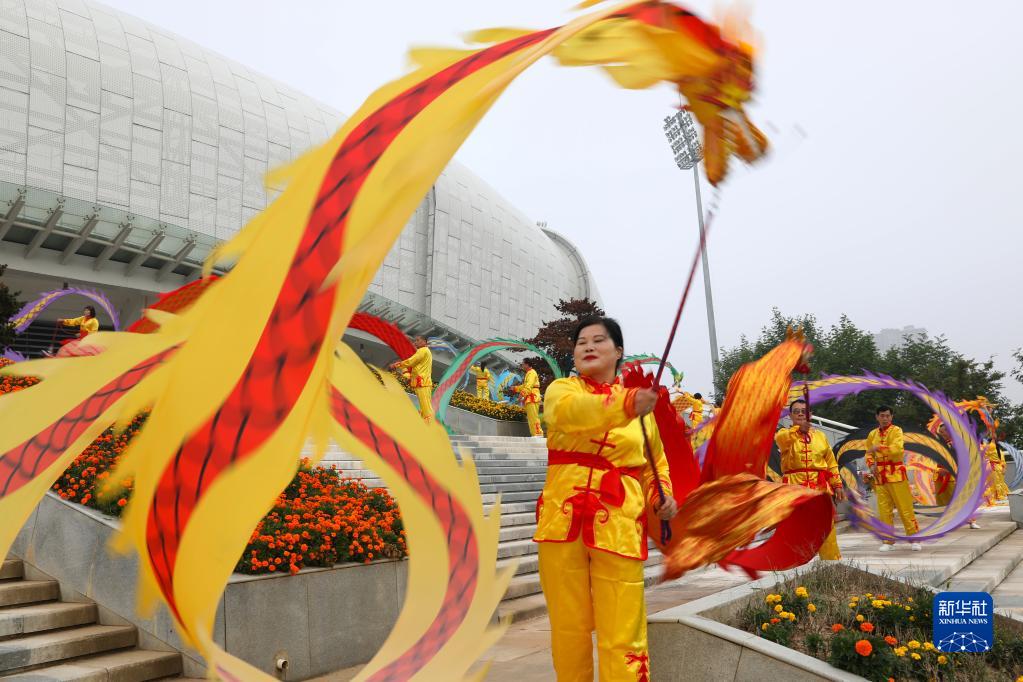 10月1日,在江苏省宝应县生态体育公园,市民舞起彩龙,欢度国庆。