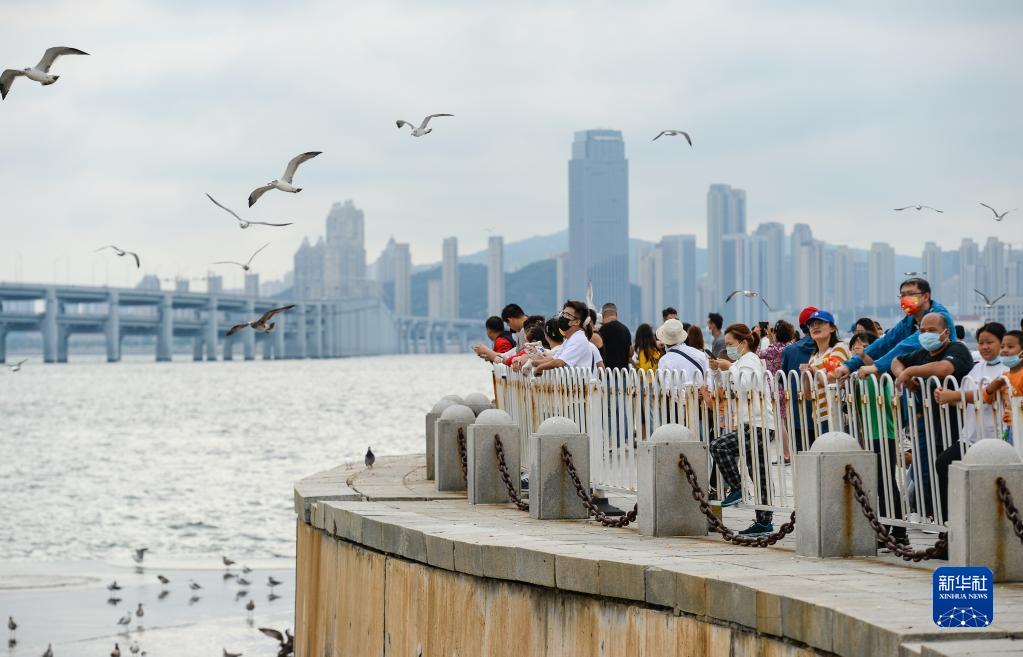 10月1日,在辽宁省大连市,市民在星海广场游玩。