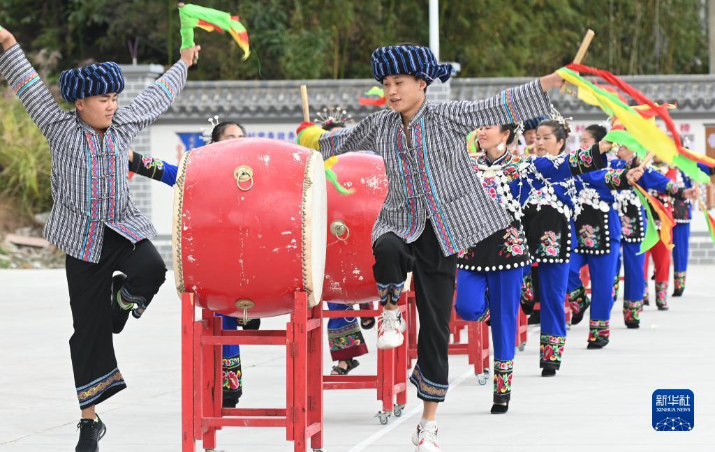 10月1日,苗族同胞在贵州省铜仁市松桃苗族自治县正大镇麻塘村打花鼓,欢度国庆。