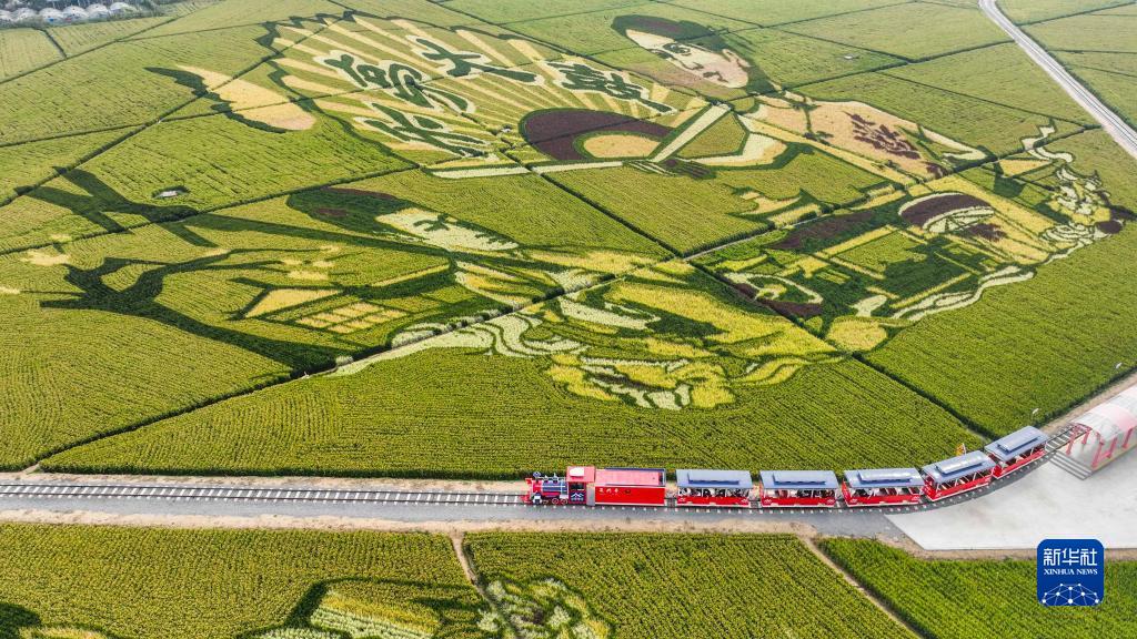 10月1日,游客乘坐小火车在河北省遵化市团瓢庄乡山里各庄村稻田画景区赏景(无人机照片)。