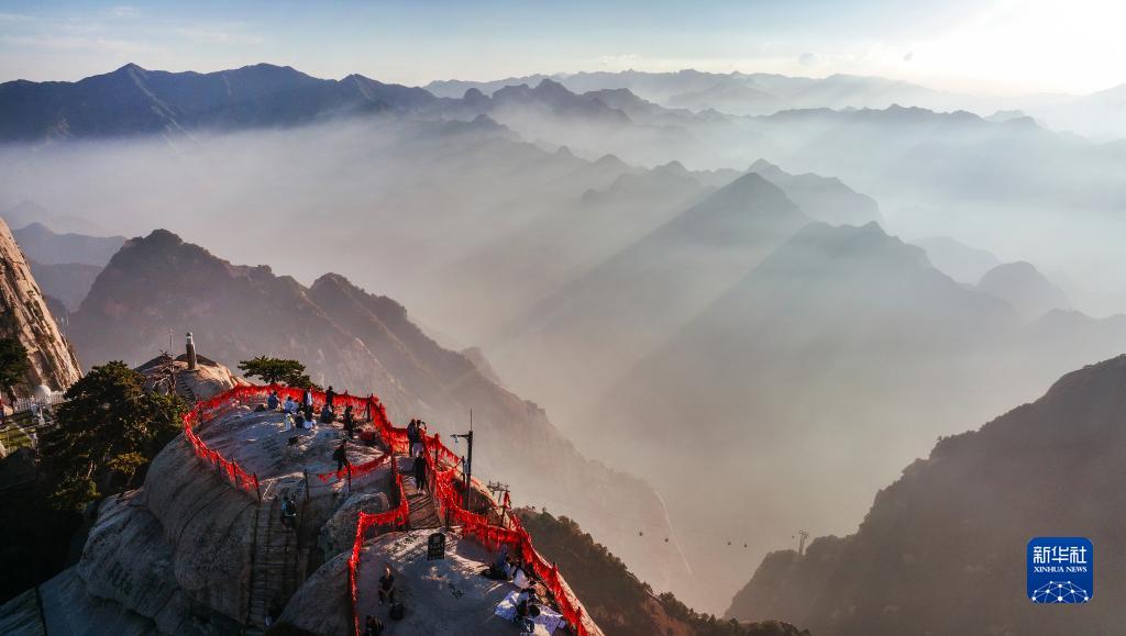 9月25日,夕阳西下,雨后初霁的西岳华山,云雾萦绕,宛如仙境(无人机照片)。