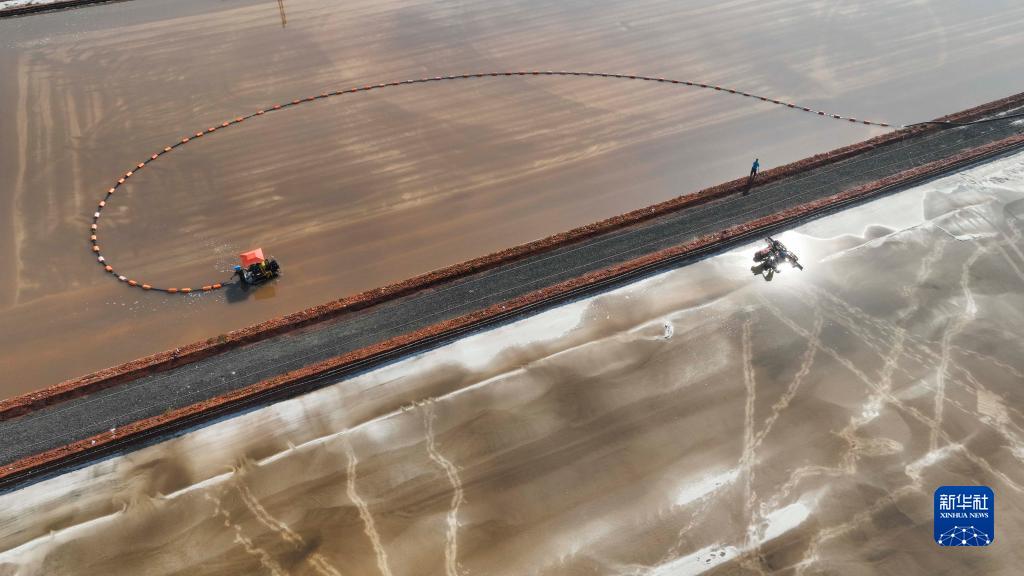9月27日,工人在唐山海港经济开发区长芦大清河盐场收获秋盐(无人机照片)。