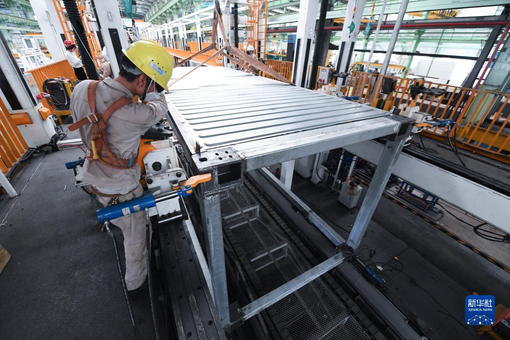 工人在智能化钢结构模块化生产线的总装线上查看(2022年9月28日摄)。
