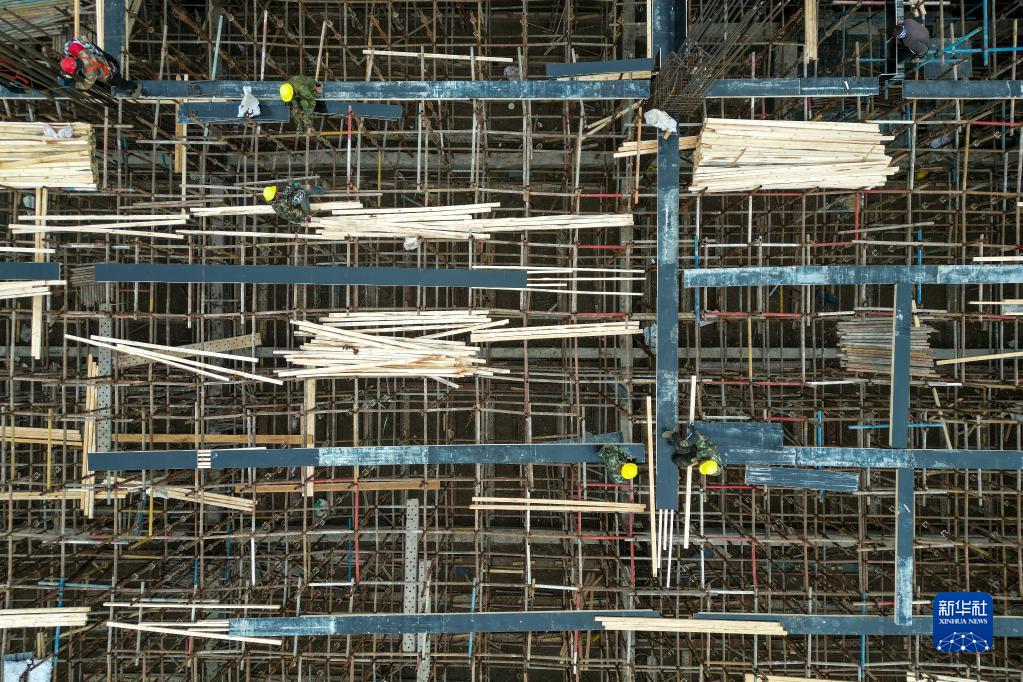 10月2日,工人在位于哈尔滨新区的哈尔滨龙江学子创业园项目工地上施工(无人机照片)。