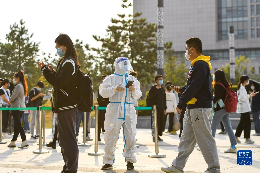 10月2日,在吉林省长春市一处便民核酸检测点,工作人员为前来进行核酸检测的市民扫码登记。