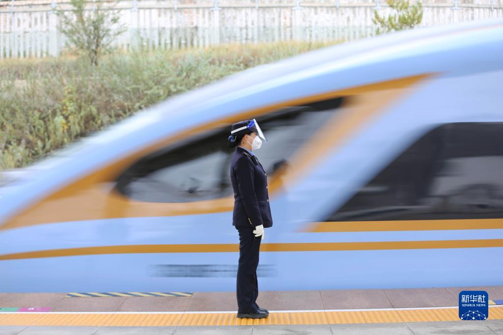 10月2日,甘肃定西北站的工作人员在站台上送车。