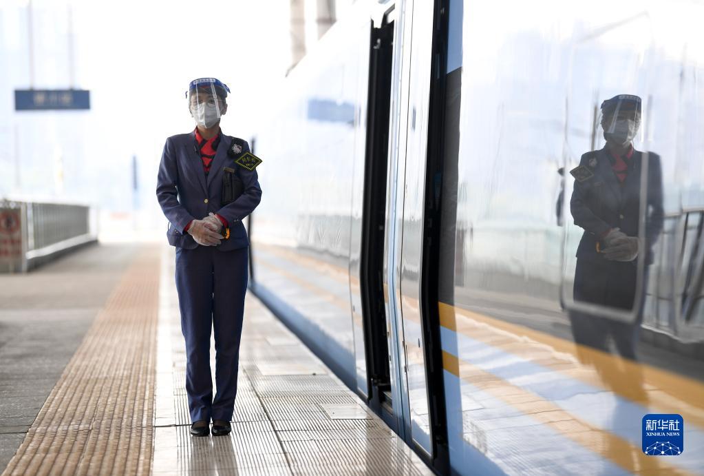 10月2日,中国铁路西安局集团有限公司西安客运段列车长王婷婷在银川站站台等候旅客乘车。