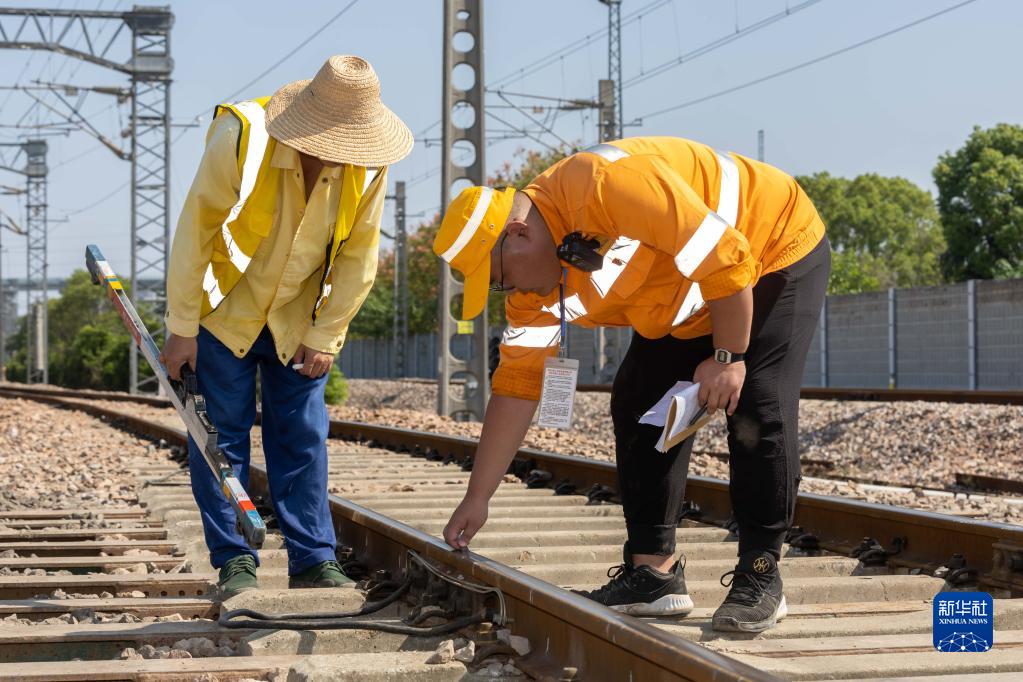 10月2日,在上海市松江区新桥镇申北四路下穿立交施工现场,中国铁路上海局集团有限公司上海工务段施工监督员陈得志(右)测量钢轨轨缝。
