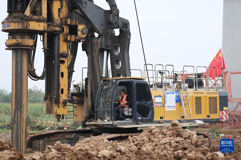 10月2日,中铁上海工程局施工人员在位于陕西省西安市的西十高铁浐河特大桥操作旋转挖机。