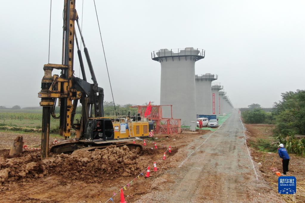 10月2日,中铁上海工程局施工人员在位于陕西省西安市的西十高铁浐河特大桥操作旋转挖机(无人机照片)。