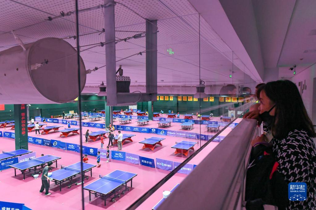 一位家长在成都市全国重点乒乓球运动学校观看孩子训练(9月29日摄)。