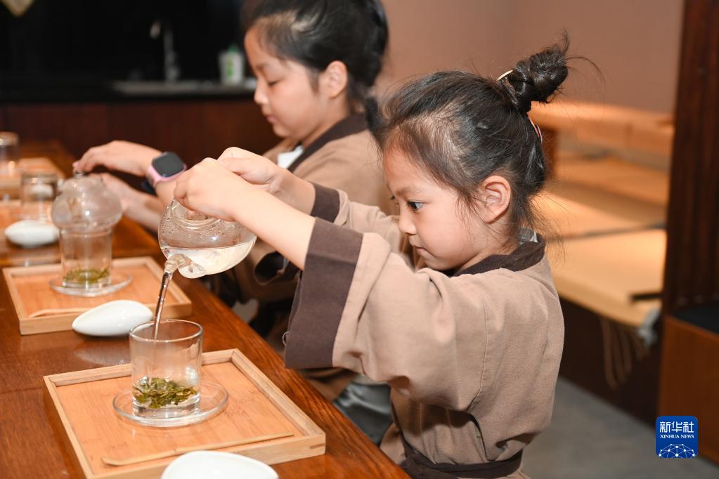 10月2日,小朋友在杭州青少年发展中心“Do都城”体验“茶艺师”。