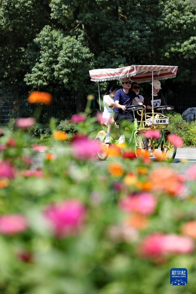 10月2日,市民在浙江省嘉兴市植物园骑行。