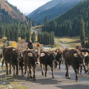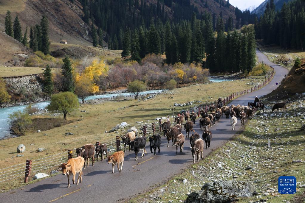 进入10月,新疆伊犁哈萨克自治州昭苏县夏特柯尔克孜族乡阔斯托别村牧民赶着褐牛走出夏塔大峡谷。连日来,随着气温降低,昭苏县各族牧民纷纷将山区峡谷里的褐牛赶往平原田野放养。