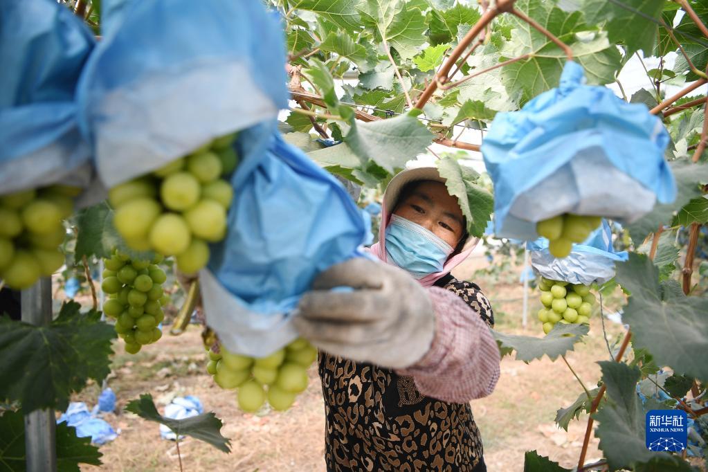 宁夏银川市永宁县望洪镇高渠村村民在大棚采摘“阳光玫瑰”葡萄(10月2日摄)。
