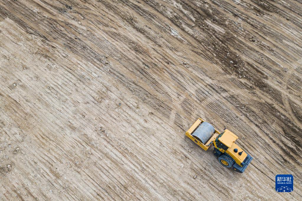 10月3日,工程机械在位于海南洋浦经济开发区的洋浦海上风电产业园项目工地施工(无人机照片)。